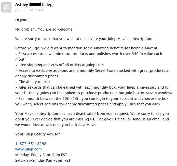 I canceled Julep via email, too. I explained I just didn’t use beauty products that quickly (some days makeup is the last thing on my mind!) but I liked all of their products.